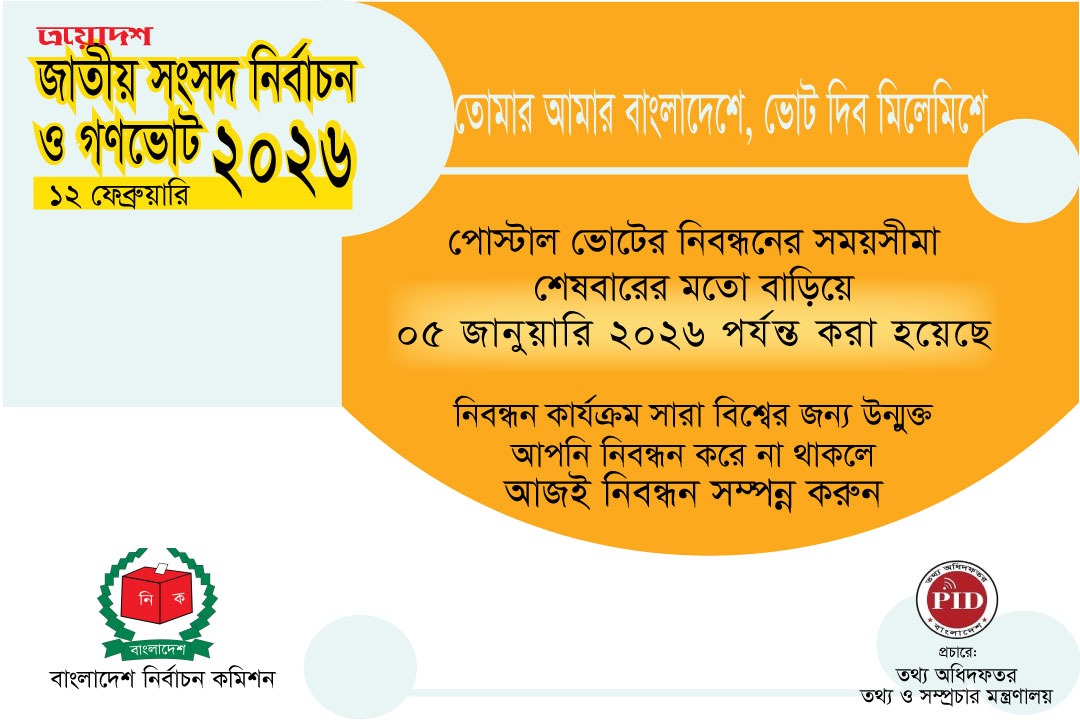 পোস্টাল ভোটের নিবন্ধনের সময়সীমা শেষবারের মত বাড়িয়ে ০৫ জানুয়ারি ২০২৬ পর্যন্ত করা হলো।